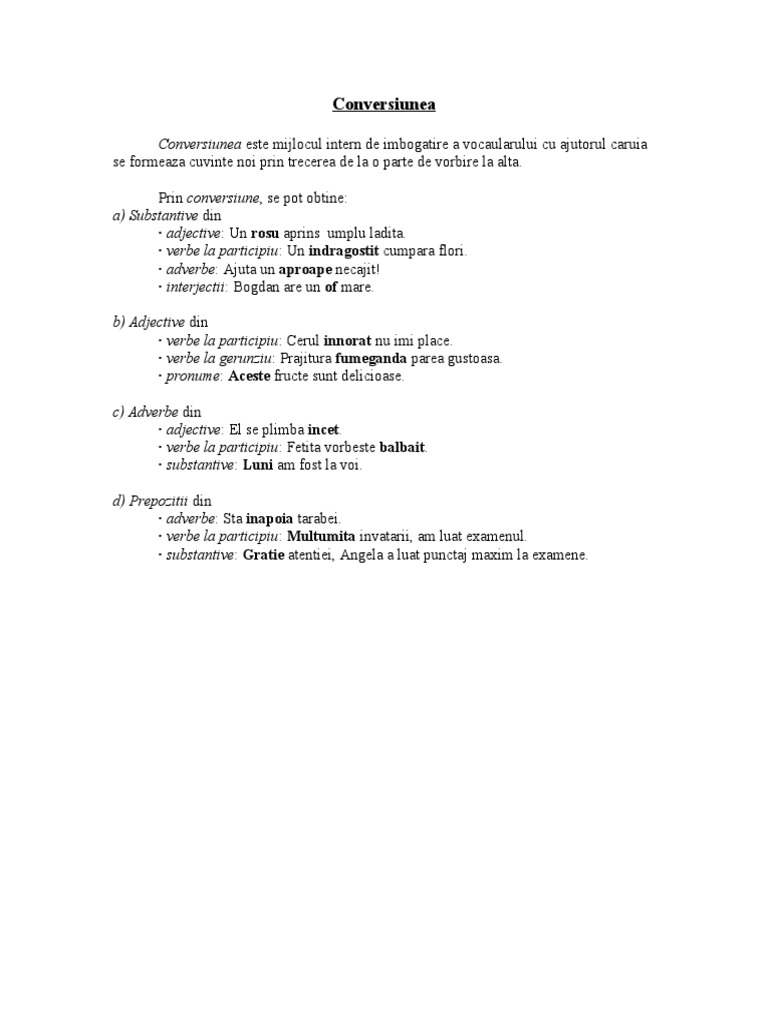 Cuvinte obtinute prin conversiune. Caterva exemple de cuvinte formate prin conversiune substantiv si adverbe obtinute prin conversiune. Unele interjecţii pot deveni substantive. Eşti pe cale să postezi un mesaj care poate încuraja pirateria şi distribuţia ilegală de materiale pe internet. B prepoziţie cu regim de genitiv el priveşte înainte.