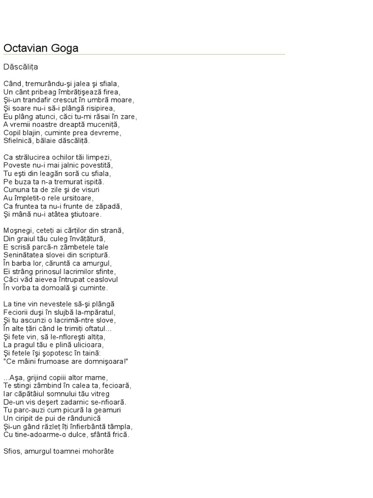 Dascalita de octavian goga. Dăscăliţa când tremurându şi jalea şi sfiala un cânt pribeag îmbrăţişează firea şi un trandafir crescut în umbră moare şi soare nu i să i plângă risipirea eu plâng atunci căci tu mi răsai în zare. La fel cum pentru a scrie poezia dascălul octavian goga l a avut drept sursă de inspirație pe învățătorul moise frățilă cel care i a fost dascăl în perioada 1886 1890 când a urmat școala primară în satul natal. Dăscălița este o poezie scrisă de octavian goga și publicată pentru întâia oară în numărul 7 din 10 aprilie 1904 al revistei luceafărul. Puteti gasi foarte multe referate accesand categoriile din partea dreapta despre octavian goga dascalita.