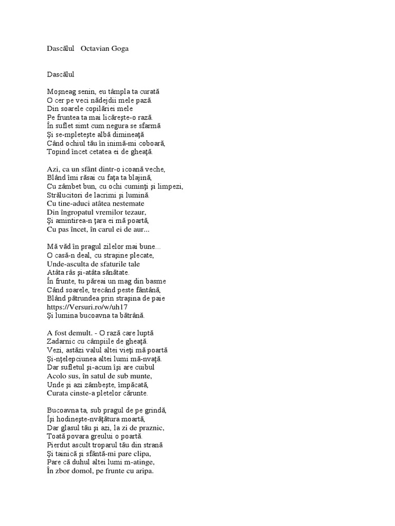 într un sfeșnic ard pe masă două lumânări de ceară plin de grije peană nouă moaie popa n călimară. Plin de grije peana noua moaie popa n calimara. Patru inşi la popa n casă ţin azi sfat de vreme lungă. A lui octavian goga ilustreaza trasaturile clasicismului si ale romantismului neoromantica prin caracterul evocator mesianic si profetic prin profunzimea si autenticitatea trairilor prin componenta patriotica prin tonul elegiac prin cultivarea imaginii poetului ea ramane insa clasica prin viziunea morala si monografica a satului transilvanean prin retorismul bazat.