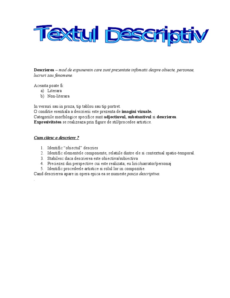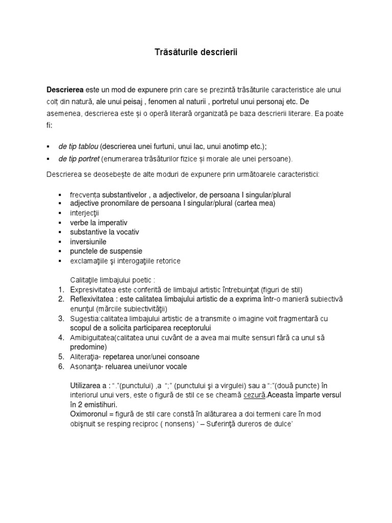 Descrierea literara tip tablou test. Descrierea este un mod de expunere prin care se prezintă trăsăturile caracteristice ale unui colț din natură ale unui peisaj fenomen al naturii portretul unui personaj etc. 0 stele 0 review uri. Descrierea literar este descrierea n care sunt prezentate trsturile unui personaj ale unui col din natur sau a unor sentimente aa cum sunt percepute de autor.