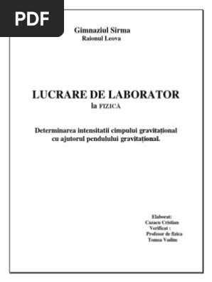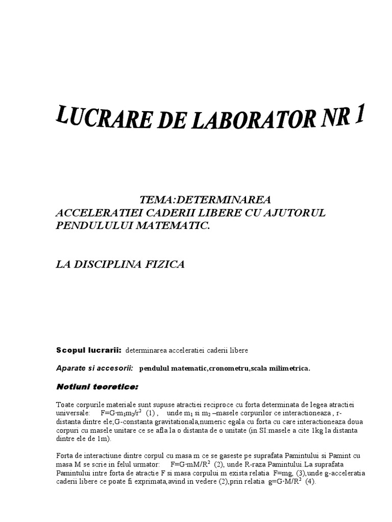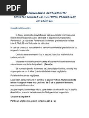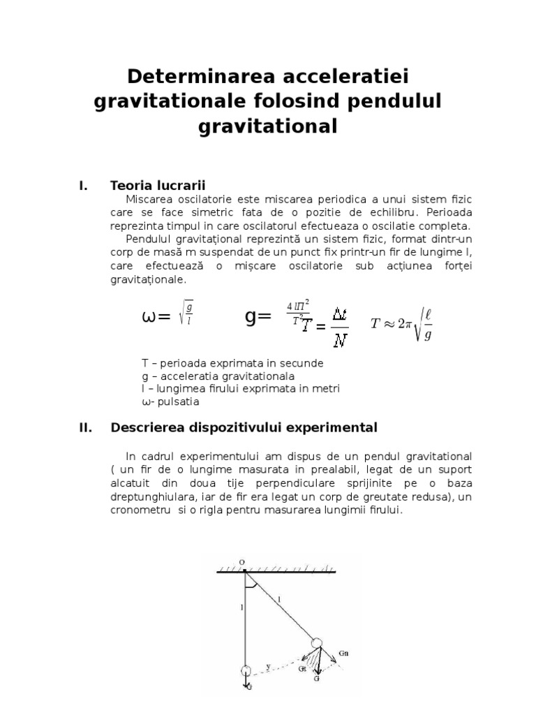 B sa se determine acceleratia graviationala locala cu pendulul simplu. Pendulul gravitational este format dintr un corp de dimensiuni reduse pm si un firinextensibil cu masa neglijabila cu un capat fixat iar cu celalalt legat la pm. Determinarea acceleraţiei gravitaţionale cu ajutorul unui pendul fizic scopul lucrării. Aceasta formula permite determinarea valorii acceleratiei gravitationale prin masurarea perioadei de oscilatie si a lungimii pendulului.