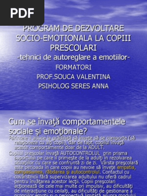 Dezvoltarea abilitatilor socio emotionale la prescolari. Controlarea sentimentelor implusive este o provocare atat pentru parinti cat si pentru profesori deoarece prescolarii sunt curiosi in mod natural cu privire la orice. Traim intr o lume in care ne confruntam cu o multime de probleme in care stresul isi pune amprenta nu doar asupra adultilor ci chiar si asupra tinerei ge neratii si mai grav asupra copiilor. Dezvoltarea socio emotionala te poate ajuta să ai copilul pe care ţi l doreşti fără să recurgi la ameninţări ultimatumuri reproşuri şi comparaţii.