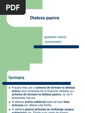 La diateza pasivă agentul care face acțiunea este fie necunoscut fie un grup de indivizi. 7 thoughts on diateza pasiva vladimir. Diateza pasiva engleza diateza pasiva engleza pasivul se formeaza conjugand verbul to be la timpul cerut de sens la care se adauga forma iii participiul trecut a verbului de conjugat. To be helped by a fi ajutat de.