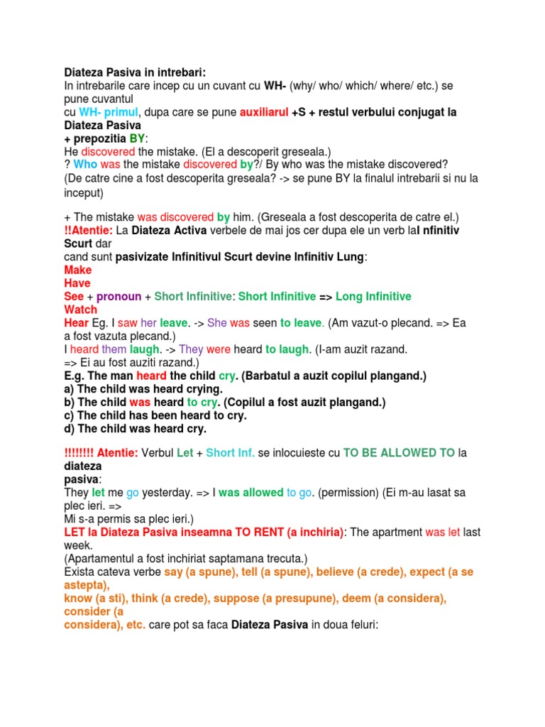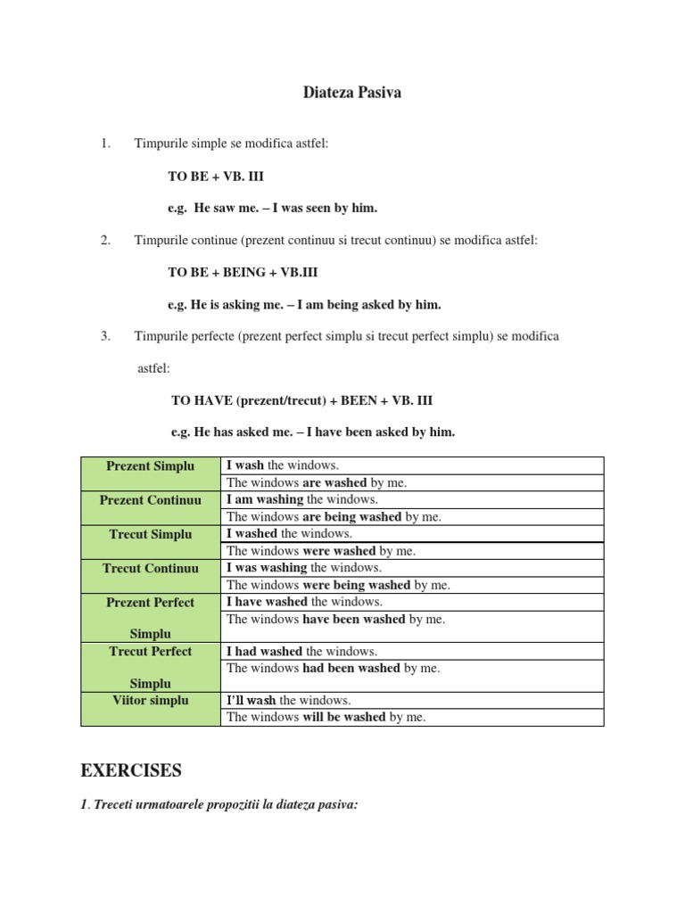 Tu faci eu sufăr diateza pasivã se foloseşte cu verbul auxiliar to be si cu forma a 3 a a verbelor la care se adaugã by dar nu în toate cazurile. Diateza pasivã se împarte in şase categorii. Eu sunt mancat de un sarpe boa. They usually assemble cars by using robots.