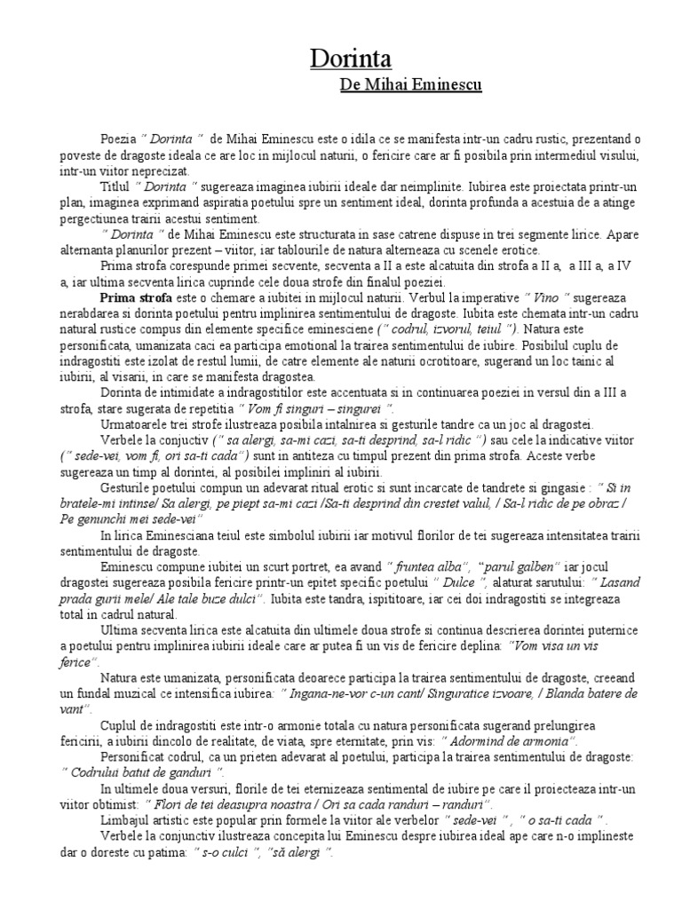 Prin atmosfera tonalitate sentimente poezia apartine primei perioade de creatie primei etape a liricii erotice. Vino n codru la izvorul care tremura pe prund unde prispa cea de brazde crengi plecate o ascund. Din multele variante publicate de perpessicius deducem că poetul concepuse poezia ca o scrisoare de dragoste adresată iubitei şi semnată e. Comentariu dorinta de mihai eminescu 16444 visits dorinta de mihai eminescu comentariu literar 14276 visits viziunea despre lume reflectata intr un basm cult studiat eseu 13127 visits comentariu testament 12418 visits.