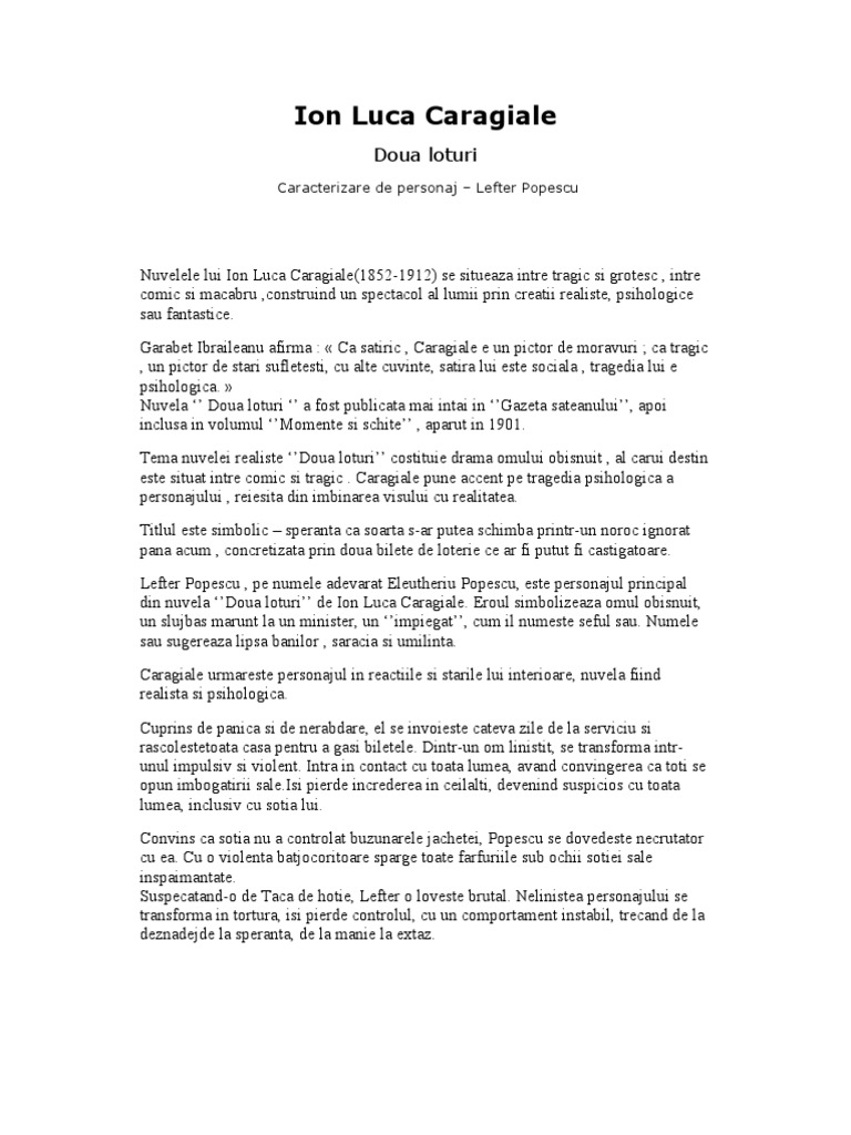 Două loturi rezumatîn această nuvelă este vorba de domnul lefter care și a pierdut două bilete de loterie cumpărate cu câteva zile în urmă. Nuvela a fost dedicată lui constantin dobrogeanu gherea. Doua loturi de i l. Caragiale rezumat21 41 doua loturi i l.