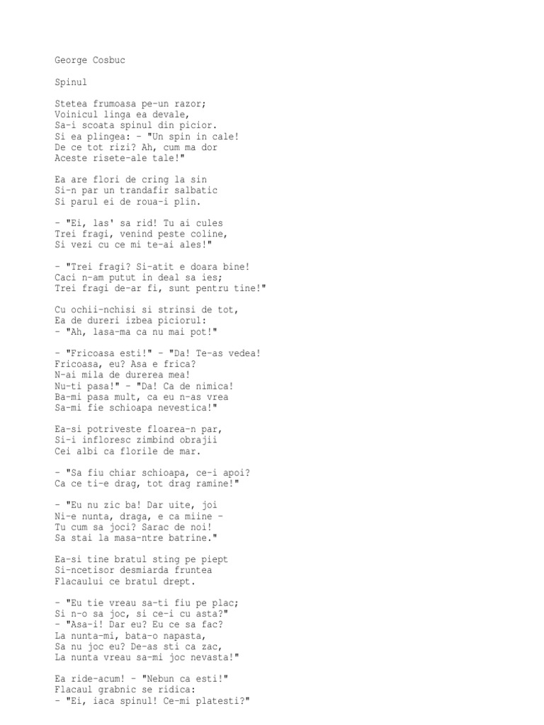 Cuvintele ei nu le ieu în sama dar mi e ruşine şi mi e greu ca scoala satu n capul meu. George coşbuc a rămas în literatura română nu numai ca scriitor şi publicist ci şi ca un distins traducător al unor valoroase opere din literatura universală. Dar n am pus doară jurământ să merg neplânsă în mormânt. De ciuda plang eu numai mama.