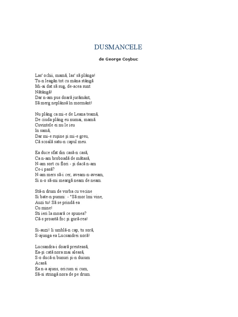 Dusmancele de george cosbuc. Las ochii mamă las să plângă. Duşmancele de george cosbuc. Nu plang ca mi e de leana teama. Tu n leagăn tot cu mâna stângă mi ai dat să sug de acea sunt nătângă.