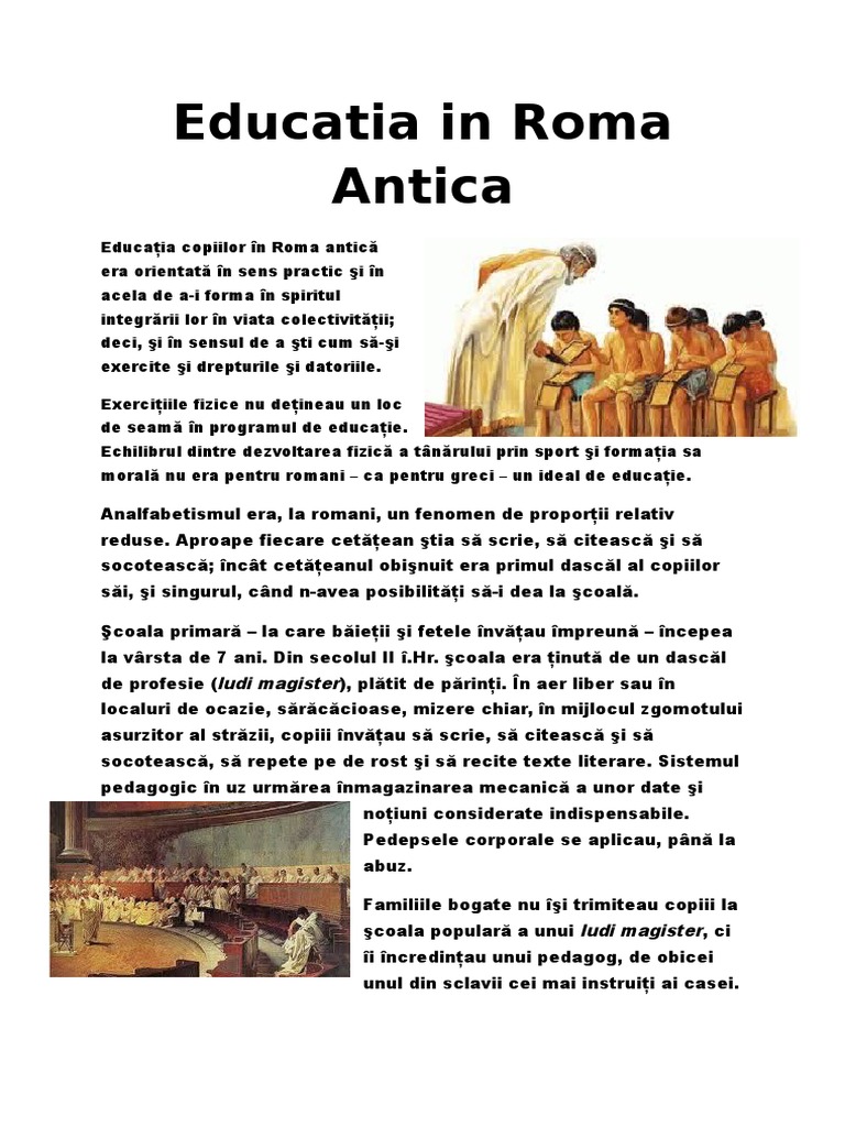 Educatia in roma antica. La începutul sec i î hr au luat naștere la roma și unele forme ale învățământului superior numite retorie sau oratorie deoarece erau conduse de un rhetor sau orator. în cursul superior învățau tineri de 16 17 ani de obicei după ce îmbrăcau toga virilis și până la 20 de ani sau chiar și după această vârstă. Educaţia copiilor în roma antică era orientată în sens practic de a i forma în spiritul integrării lor în viata lasă un răspuns anulează răspunsul introdu aici comentariul tău. Educatia in roma antica referat educatia in roma antica viata cotidiana a romanilor in antichitate repere hrana populatie romane si elene in antichitate antic.