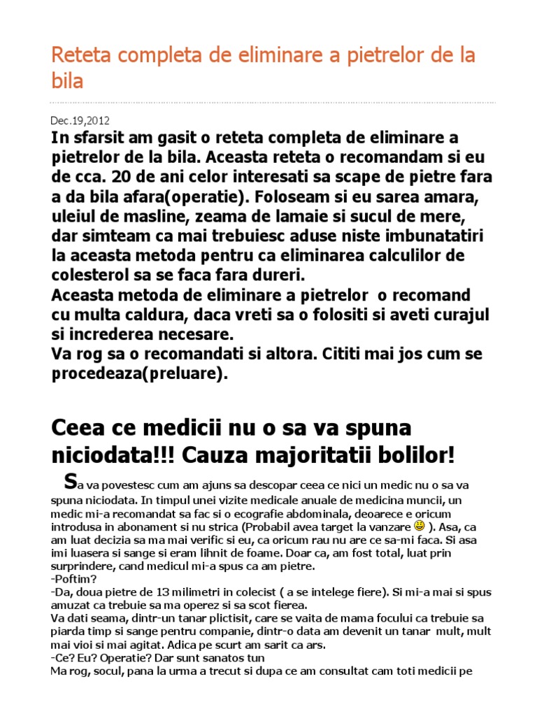 Deci pe pielea mea am testat si mi am demonstrat ca noi de fapt avem ficatul infundat cu o gramada de pietre de colesterol si functionam cam la jumatate de capacitate tot timpul cum sa eliminati fara durere pietrele din fiere sau ficat reteta valeriu popa chiar si daca numai 40 din ficat functioneaza normal analizele pot iesi bune. Eliminare pietre fiere fara operatie. Există riscul unui icter mecanic prin înfundarea canalului coledoc. Bila are rolul de a ajuta în procesarea hranei.
