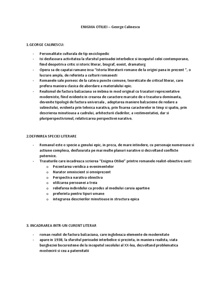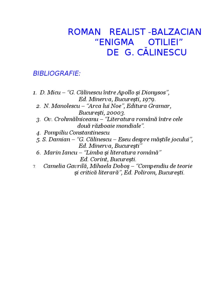 Astăzi parcurgem împreună enigma otiliei și chiar dacă pare un comentariu literar mai lung vă promit că îl voi structura în așa fel încât să fie ușor de parcurs și mai ales complex. George călinescu a fost critic istoric literar scriitor publicist si academician roman. Intitulat iniţial părinţii otiliei enigma otiliei este un roman aparținând realismului. Opera literara enigma otiliei este un roman social realist de tip balzacian avand toate caracteristicile acestuia.