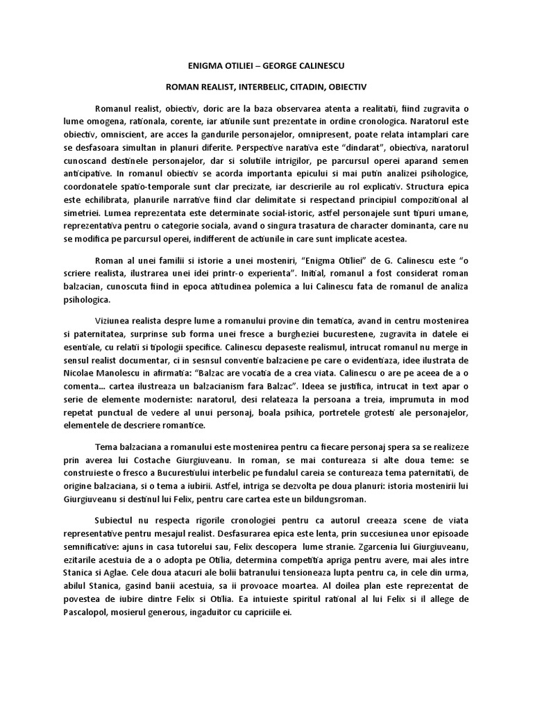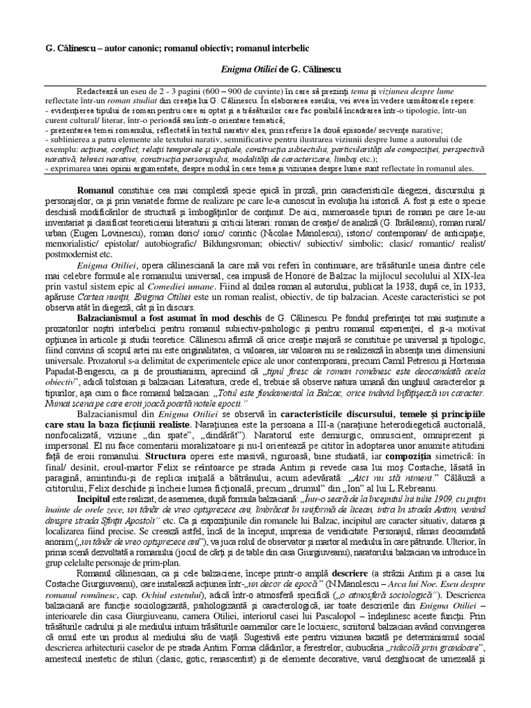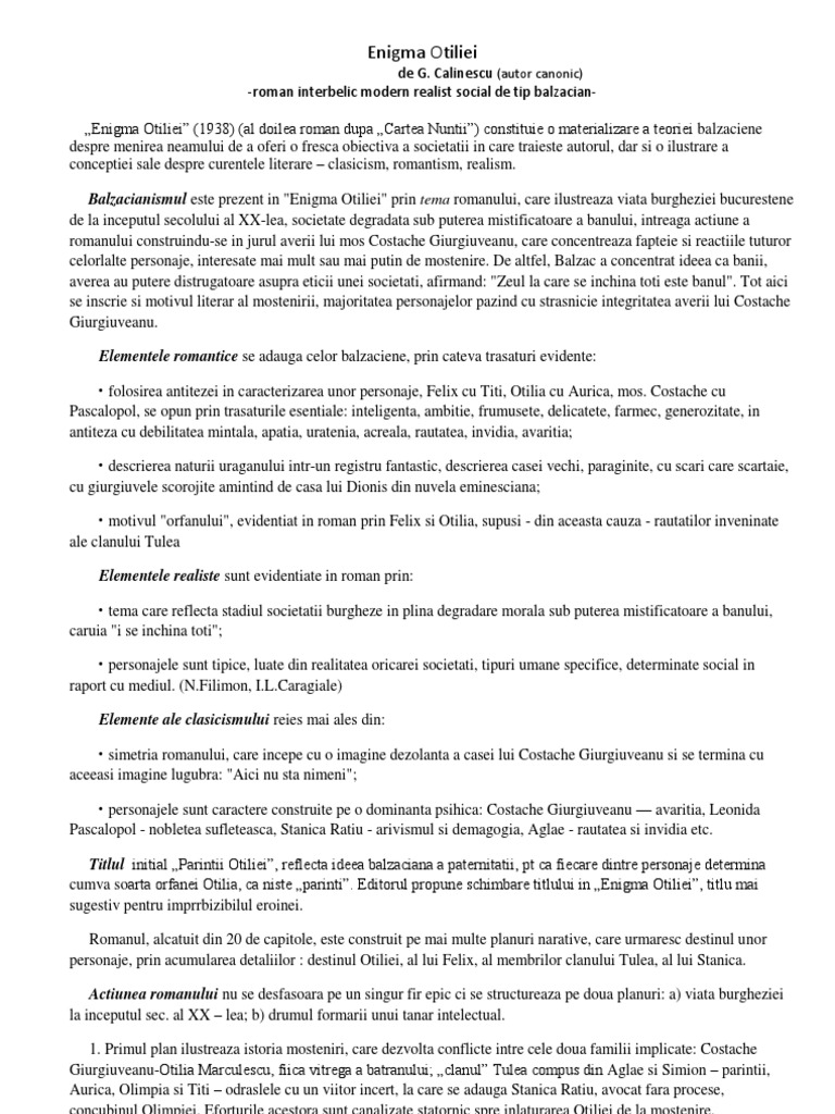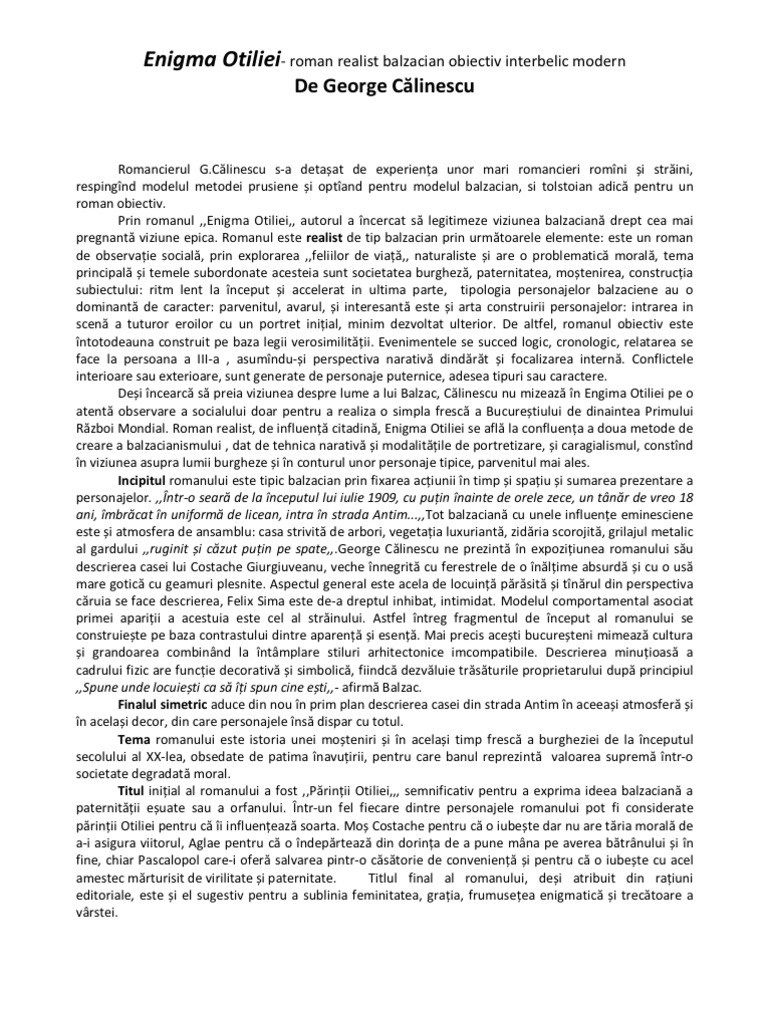 Ca teoretician acesta respinge proustianul și pledează pentru realismul clasic ilustrat prin romanul de tip balzacian. Enigma otiliei de g călinescu subiecte bac. Enigma otiliei de george călinescu argumentare roman interbelic realist obiectiv de tip balzacian opera literară enigma otiliei de george călinescu a apărut în perioada interbelică anul 1938 si este primul nostru roman citadin modern obiectiv de tip clasic si balzacian.