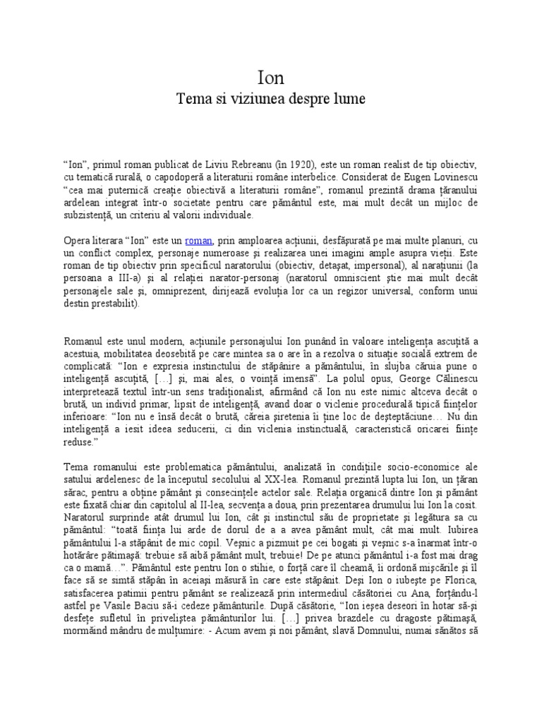 Enigma otiliei eseu tema si viziunea despre lume. Respectându şi concepţia despre literatură liviu rebreanu a creat prin romanul ion o operă durabilă detaşându se de faptele prezentate şi de personajele concepute. Am in vedere cand afirm aceasta alegerea scriitorului de a aborda tematica rurala si de a aduce in prim plan imaginea taranului. şcoala biserica judecătoria personalităţi ale momentului.
