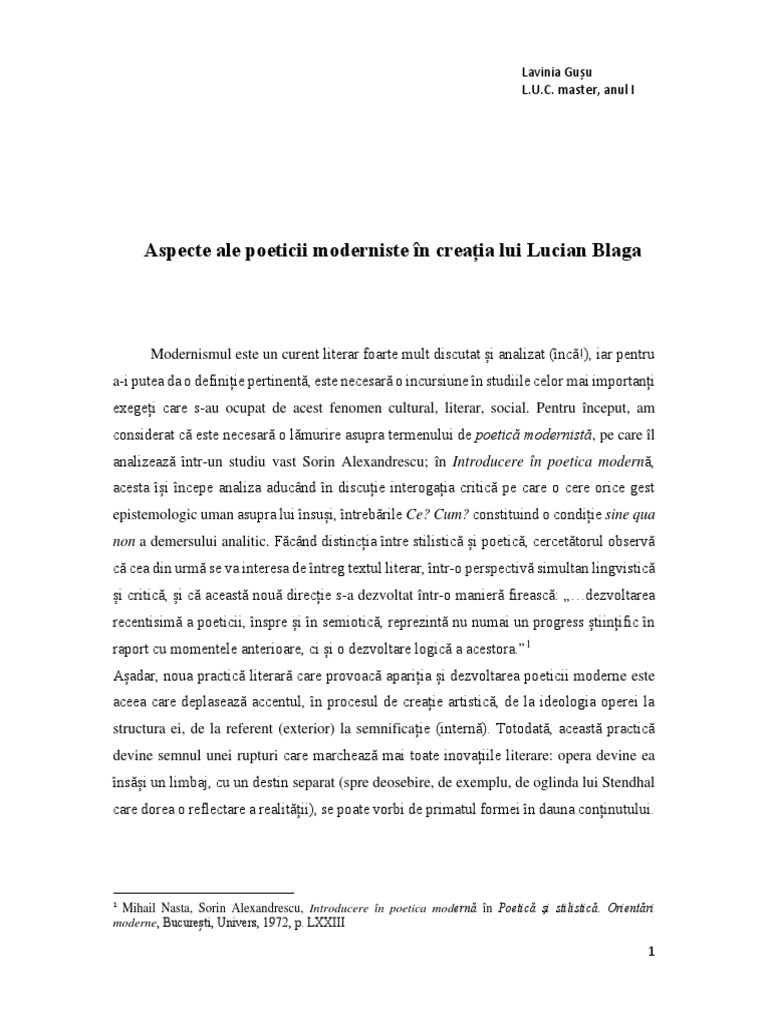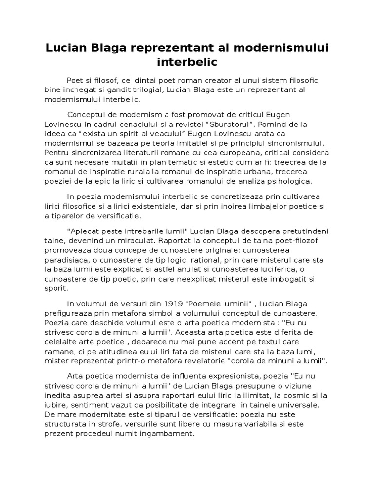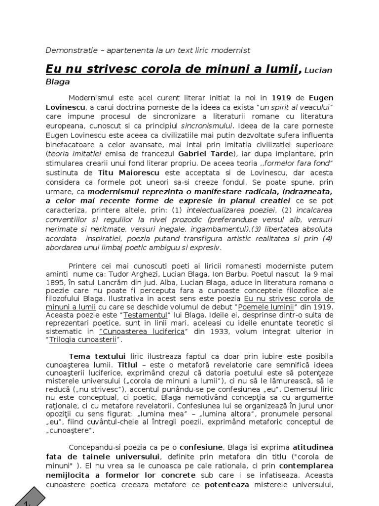 Eu nu strivesc corola de minuni a lumii modernism. Contrar a ceea ce am fi tentați să credem acesta nu pledează pentru dezlegarea acestor taine ci dimpotrivă. Eu nu strivesc corola de minuni a lumii eu nu strivesc corola de minuni a lumii şi nu ucid cu mintea tainele ce le ntâlnesc în calea mea în flori în ochi pe buze ori morminte. Modernism eu nu strivesc corola de minuni a lumiişi nu ucidcu mintea tainele ce le ntâlnescîn calea meaîn flori în ochi pe buze ori morminte lumina altorasugrumă vraja nepătrunsului ascunsîn adâncimi de întuneric dar eu eu cu lumina mea sporesc a lumii taină şi ntocmai cum cu razele ei albe lunanu micşorează ci tremurătoaremăreşte şi mai tare taina nopţii aşa. Eu nu strivesc corola de minuni a lumii de lucian blaga comentariu eu nu strivesc corola de minuni a lumii.