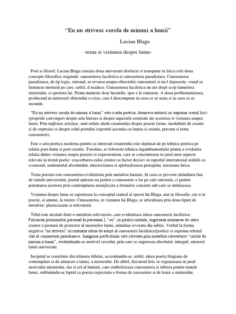 Eu nu strivesc corola de minuni a lumii tema si viziunea despre lume. Dar si. Lucian blaga face parte din seria artelor poetice moderne ale literaturii române din perioada interbelică alături de testament de tudor arghezi şi joc secund de ion barbu. In sistemul liric blagian acest text reprezentativ ocupa un loc important concentrand ca intr un focar tendinte specifice operei poetului si.